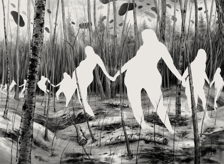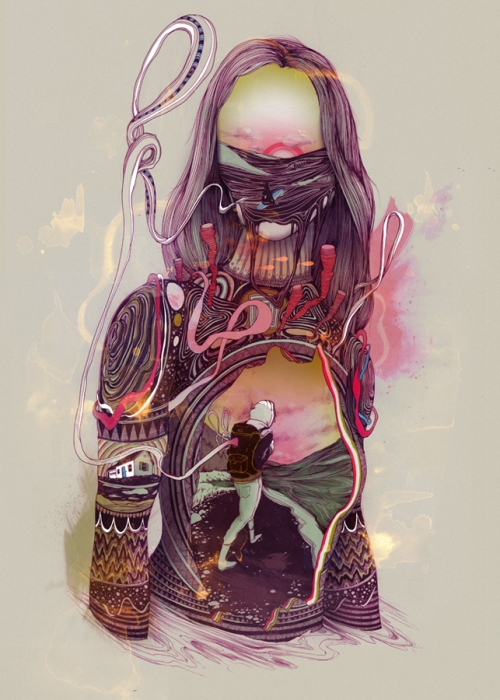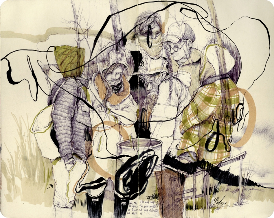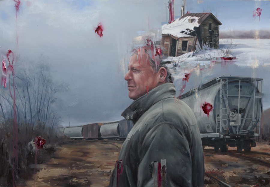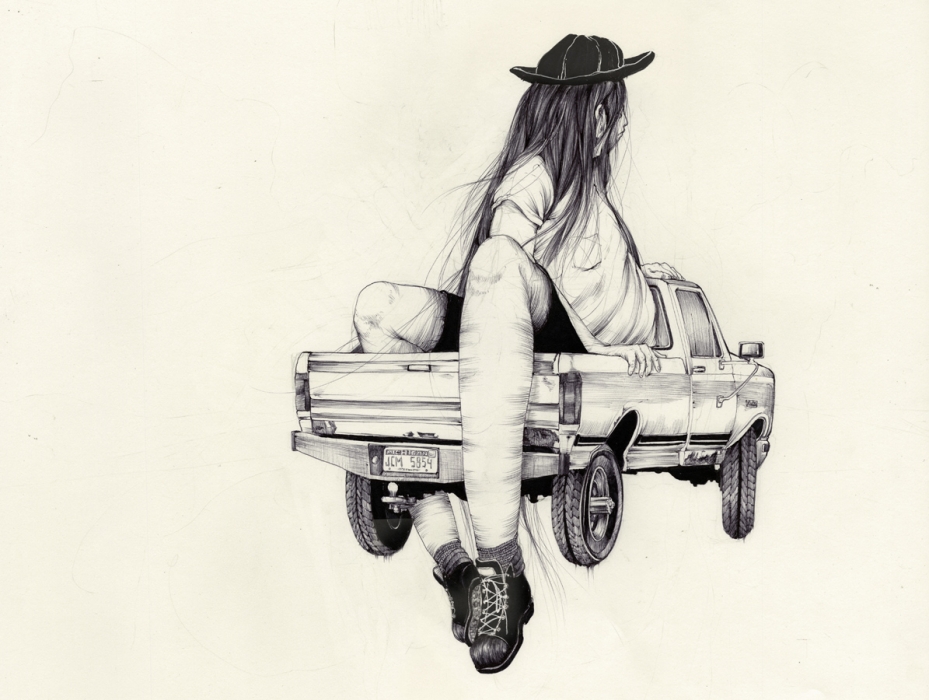 Concerning human experiences, he’s had a few. From train jumping throughout the West to Alaskan residencies to speaking engagements in Barcelona that lead to European hitch-hiking adventures, he’s got a lot to draw from. Personally, I enjoy his hyper-realistic portraiture juxtaposed against misplaced structures and gestural linework, along with his spacious landscapes with very definite borders.