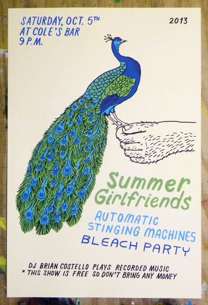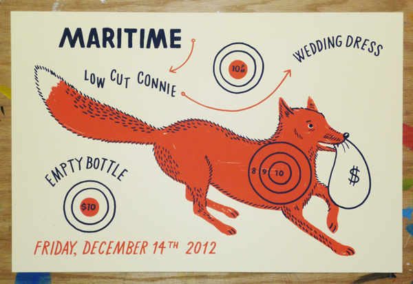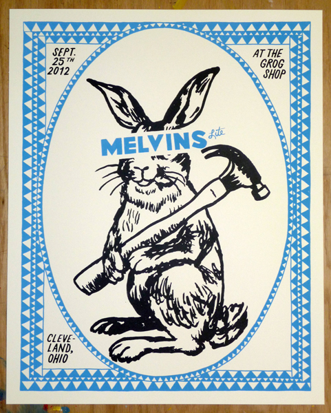 Duggan’s gig poster work, and generally his design work over all, has a fairly minimal approach. He’s got the eye of a comic artist, both with his overall style and with the quips he works into the compositions. They’re damn funny and lighten the tone of the gig poster, which is often viewed as a serious, over-complicated piece of work. With such a distinctive style and an awesome attitude about poster-making and printing, Duggan has a good thing going.