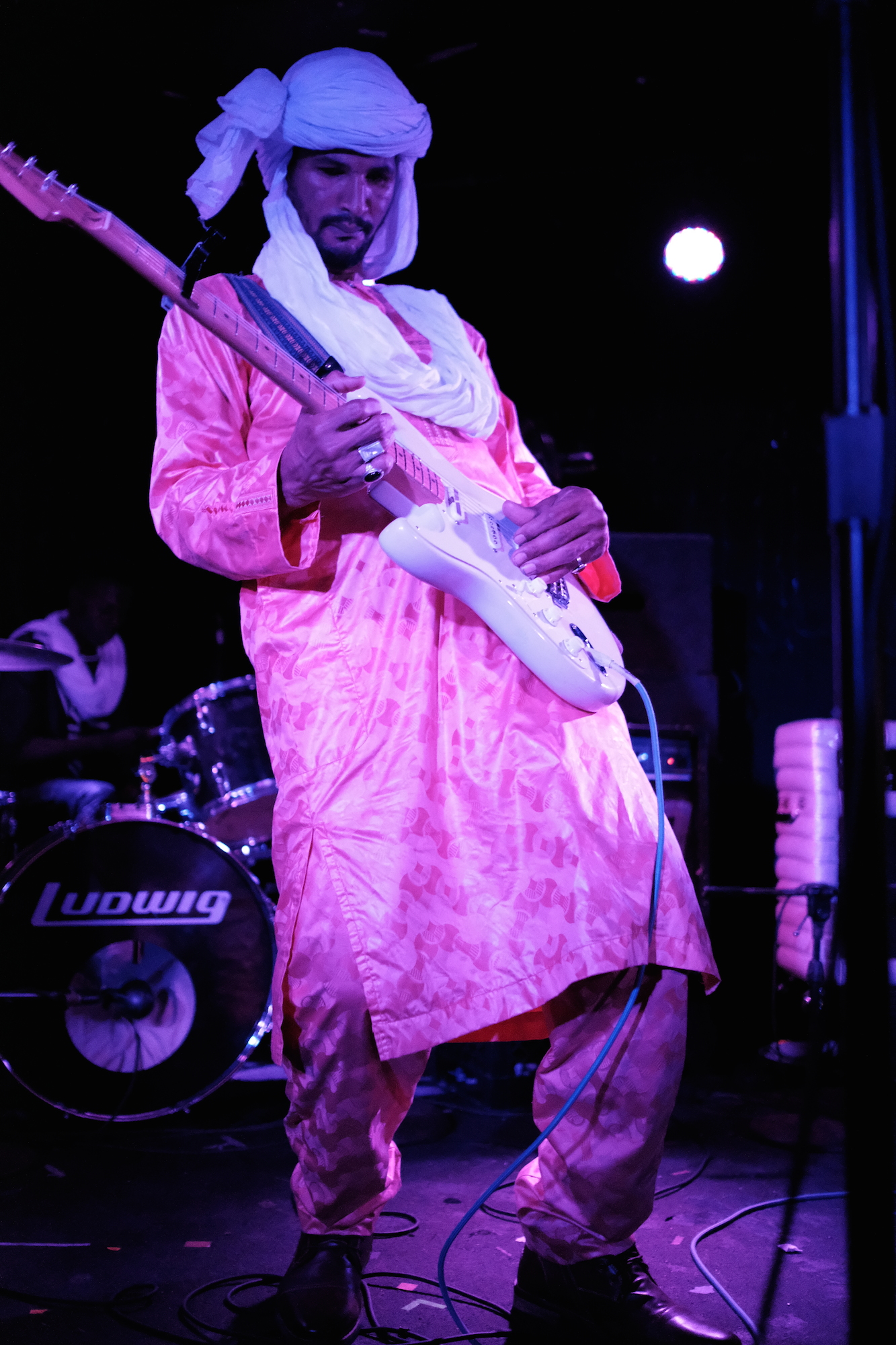 The songs often started with a guitar tease, a taste of the theme they would meditate on. Then, each member would join to build around it. The drummer set the tone of the song. He held the sticks at their ends. It was a distinction I hadn’t thought about until I watched him use the full length of them. Keeping rhythm, but also peppering in complex fills under the music. Michael Coltun’s bass layered a walking melody under the music. The kick drum gave us the rhythm for our hips, the bass our feet. The rhythm guitarist, Ahmoudou Madassane, maintained the groove and pushed the music forward. I was really impressed with his subtle tempo increases, and how everyone else responded in time. All of these things came together to make for a perfect foundation for Moctar to make his guitar sing, and for the audience to have a dance party.