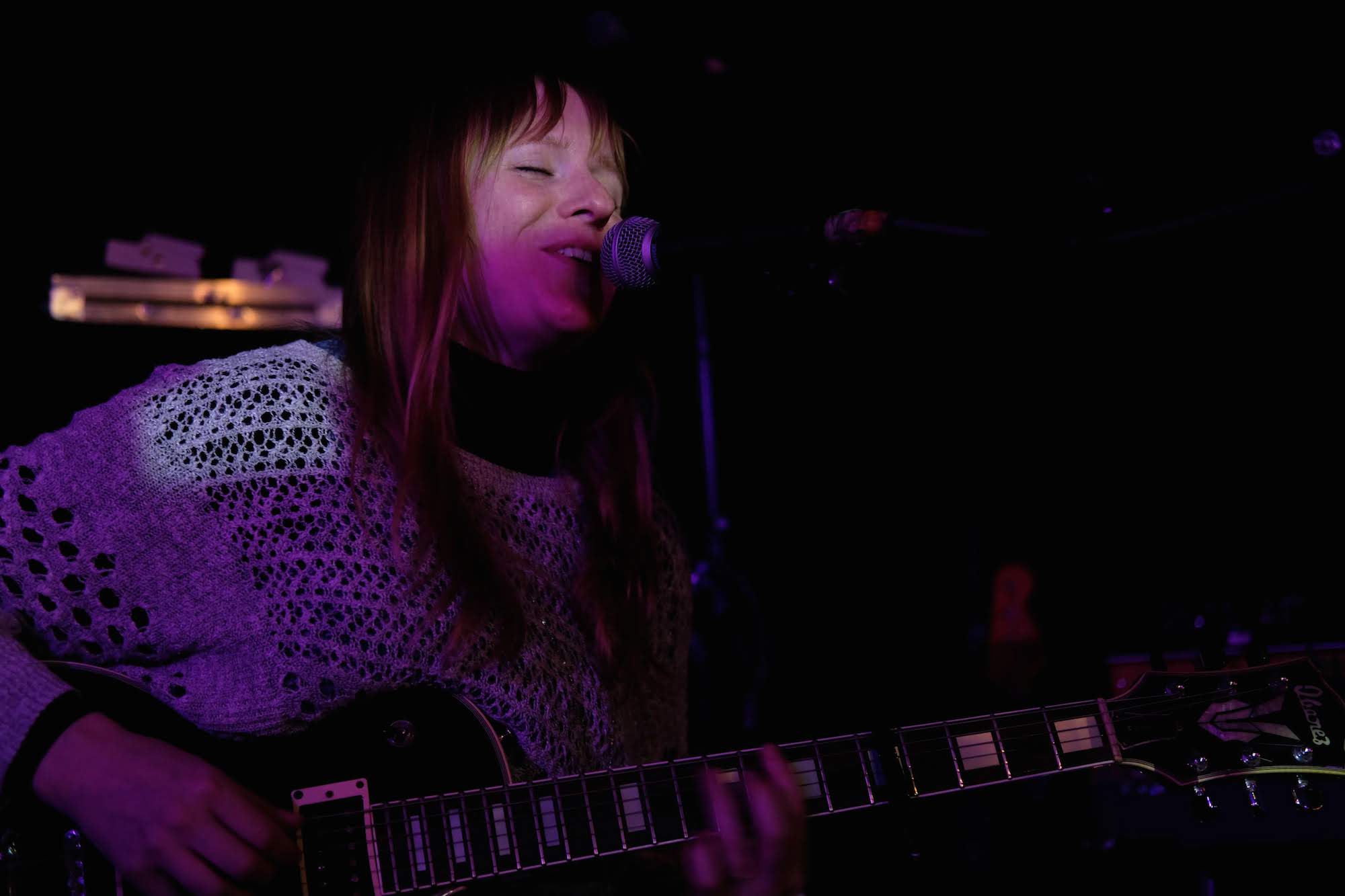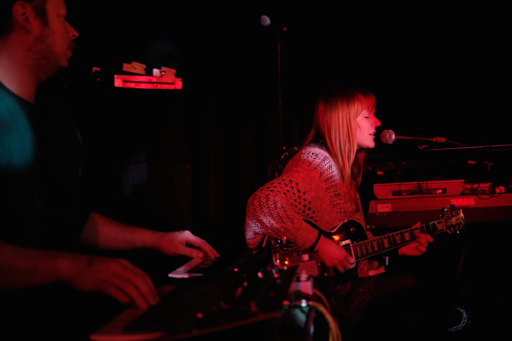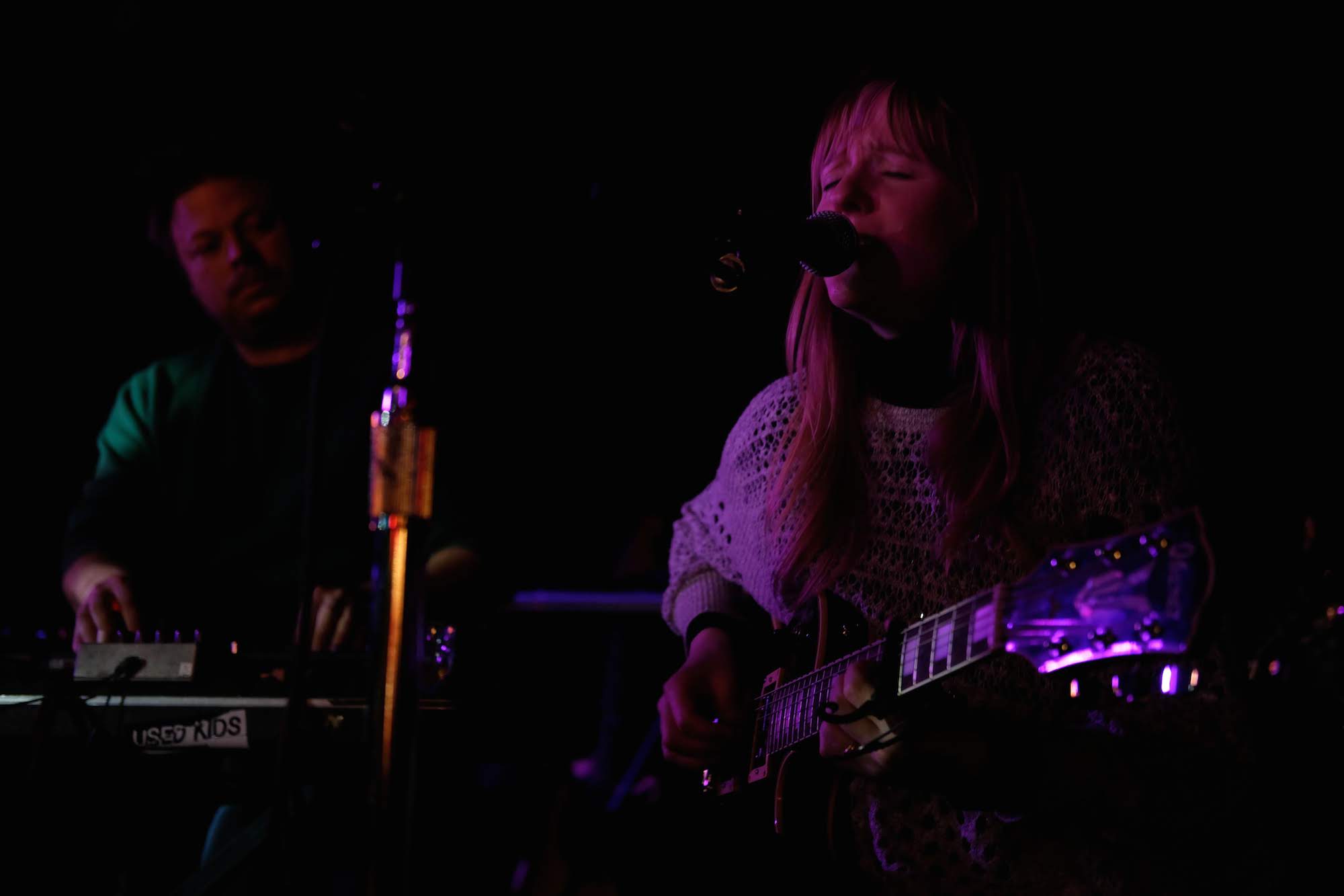 As I watched Jessica Risker perform I felt like I was in a dream world. As she gently strummed her guitar, the subtle atmospheric synths rose and retreated. And her voice–it was crystalline. Sharp, floating, and beautiful. If it were just Jessica, it would have been a classic singer-songwriter set, but the addition of Josh on keys and electronics brought a surreal quality. The projections also added to the dreamy effect; simple white shapes moved across the stage like floating in a world that was either underwater or digital.