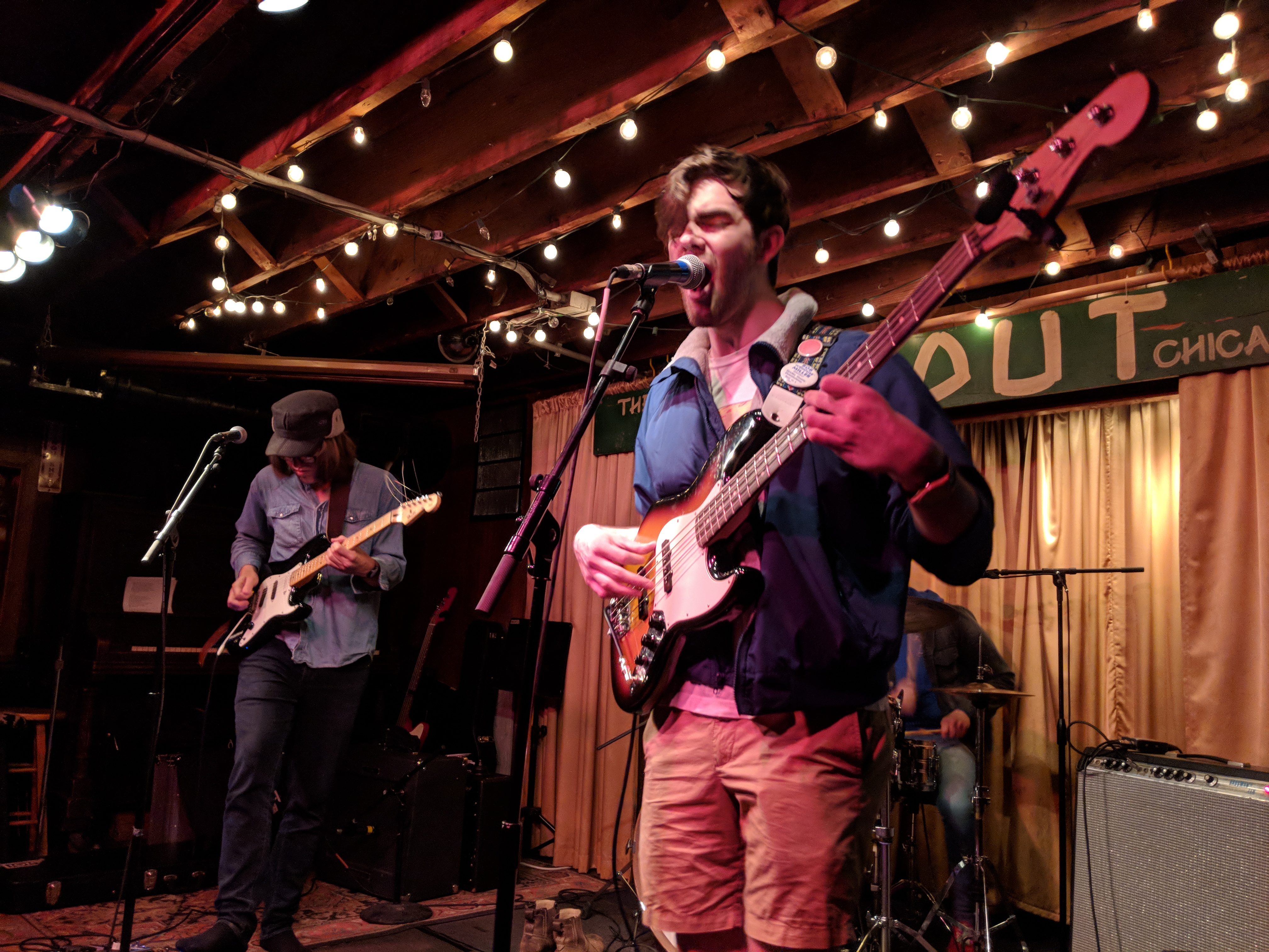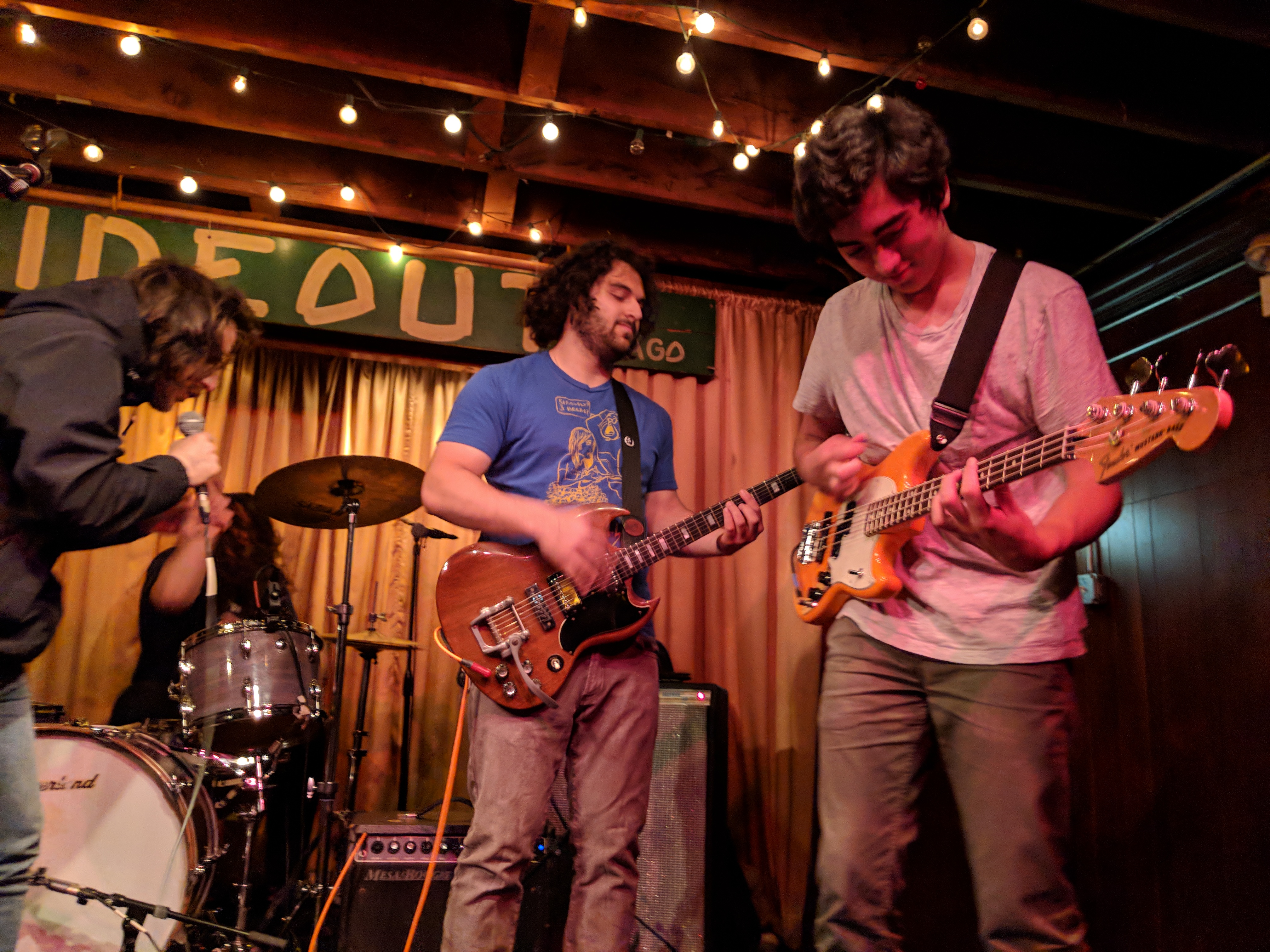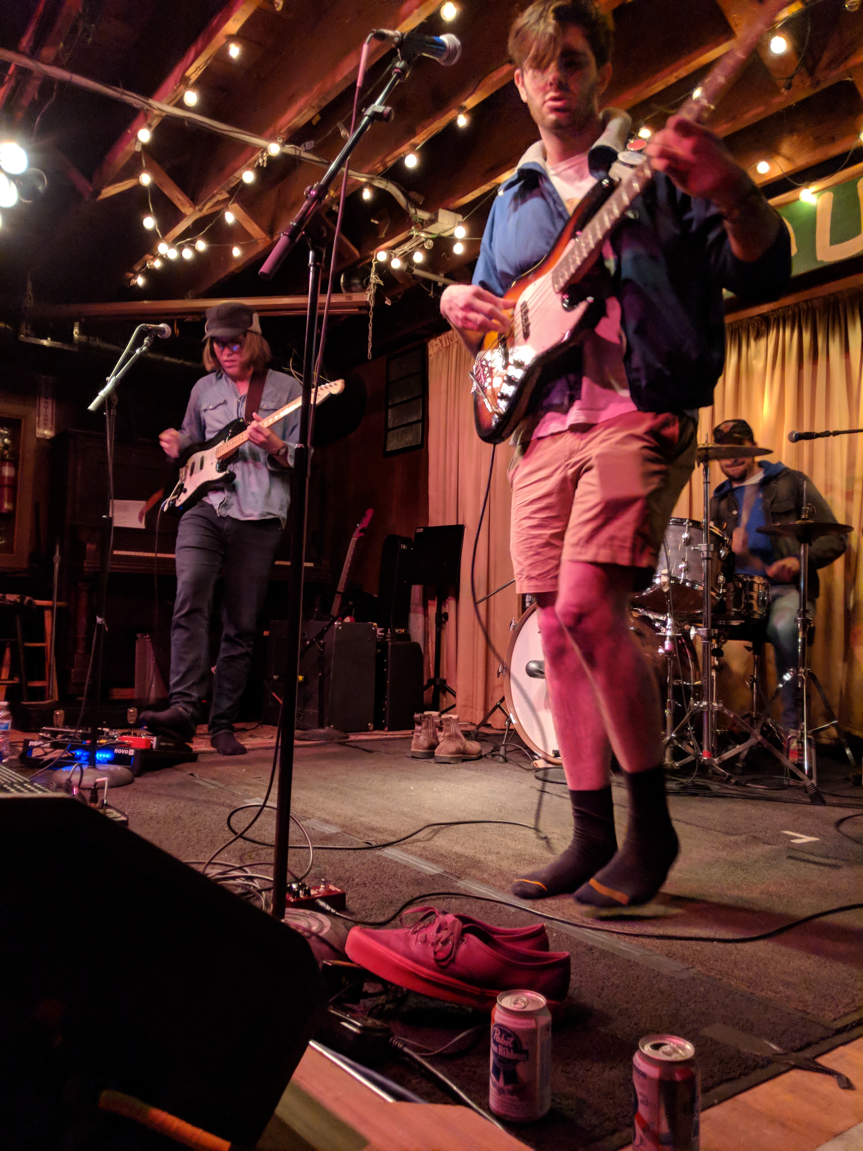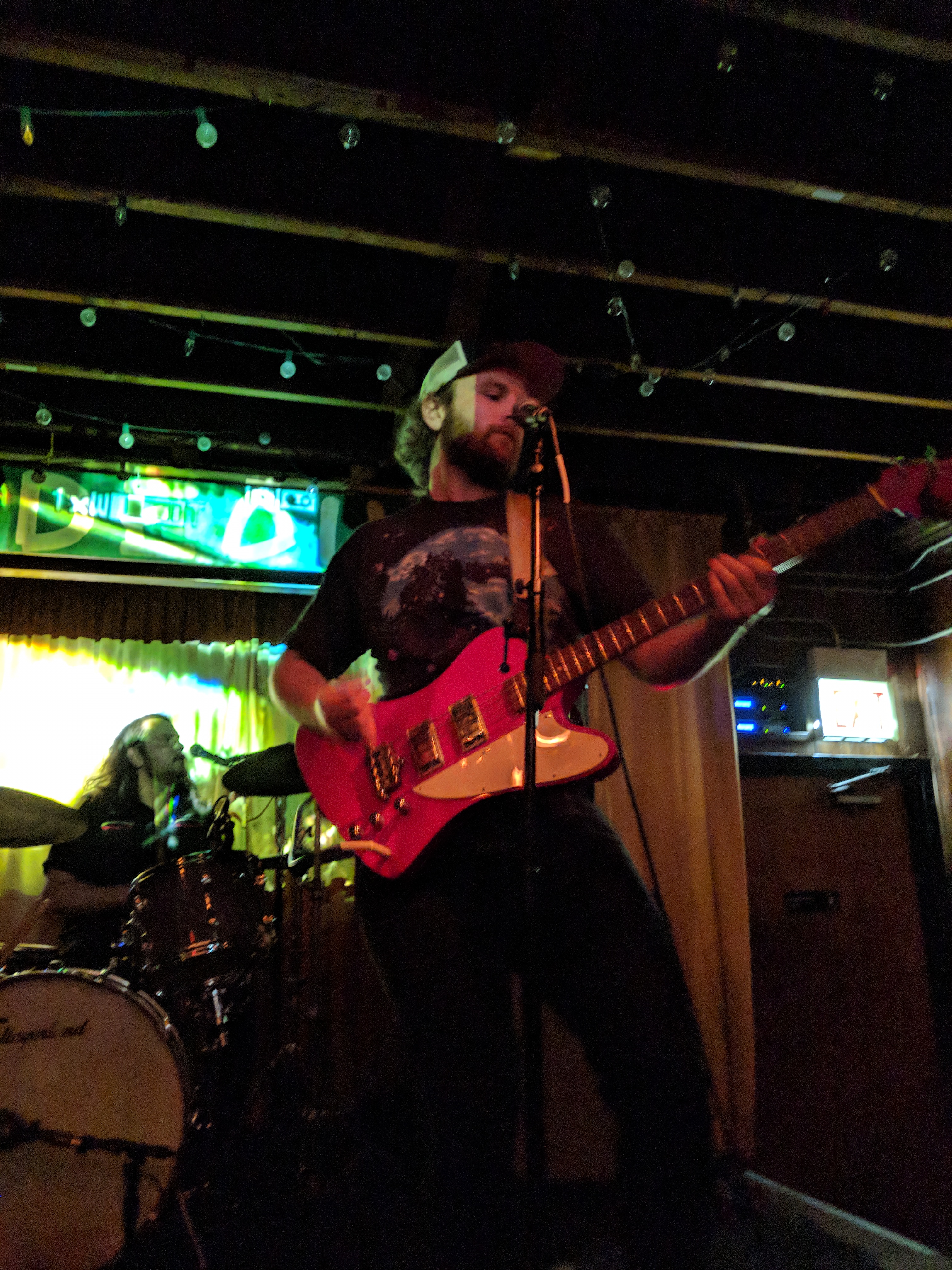 Pointers had three guys on the stage and a fourth experimenting with projecting images onto the band. In the way it was used, I’m not sure it added anything beyond blinding the drummer. The three musicians definitely seemed to be exploring their way through the set. Chatter about what song to play next may have been intended to seem improvisational, but it drained some of the energy from the room. But, they had nice bouncy tunes. I especially liked “Streetcrosser,” and did feel driven to go find it on their Bandcamp page afterwards for repeat listens. Hopefully, they will continue to develop and tighten their stage craft.