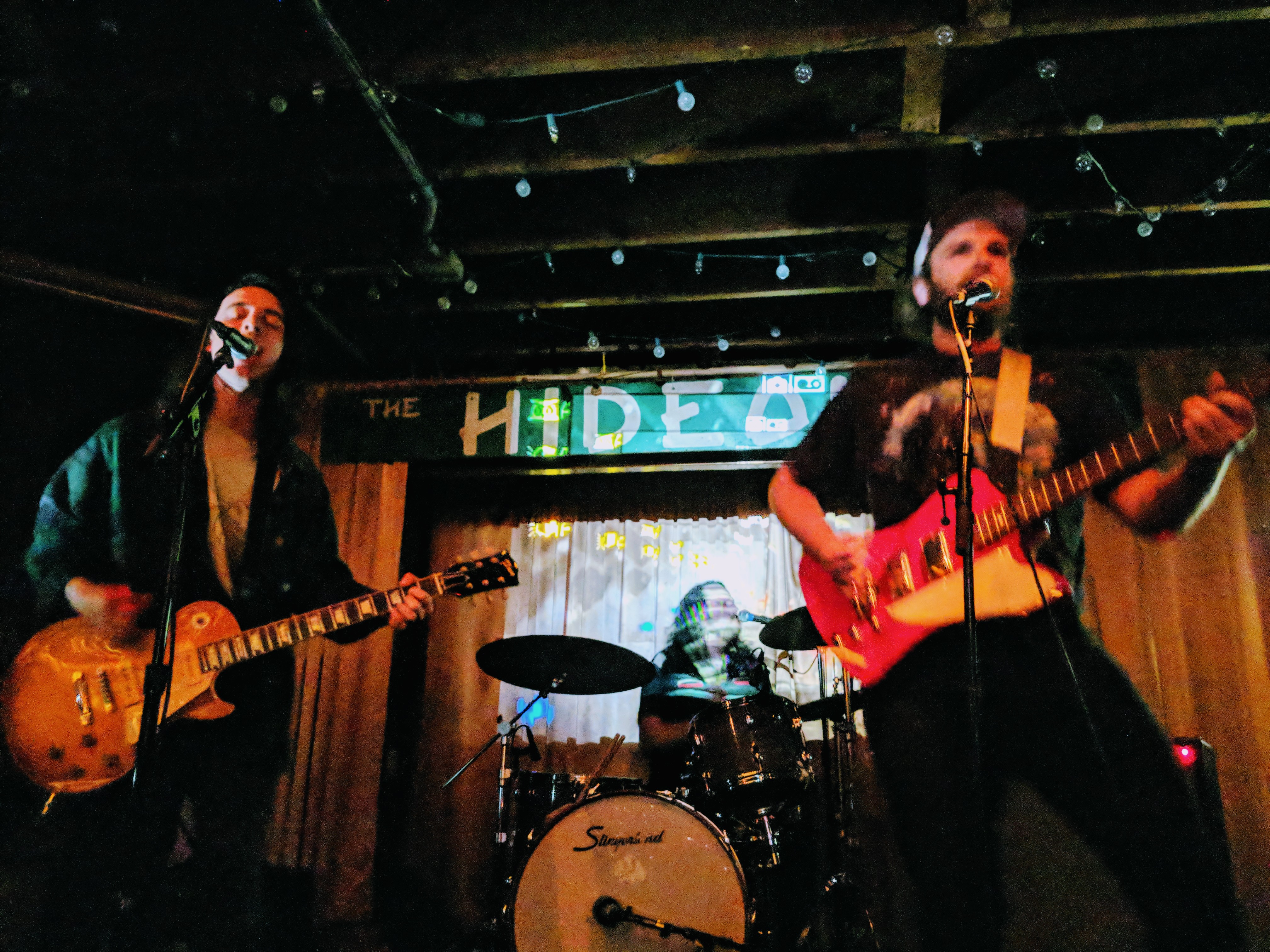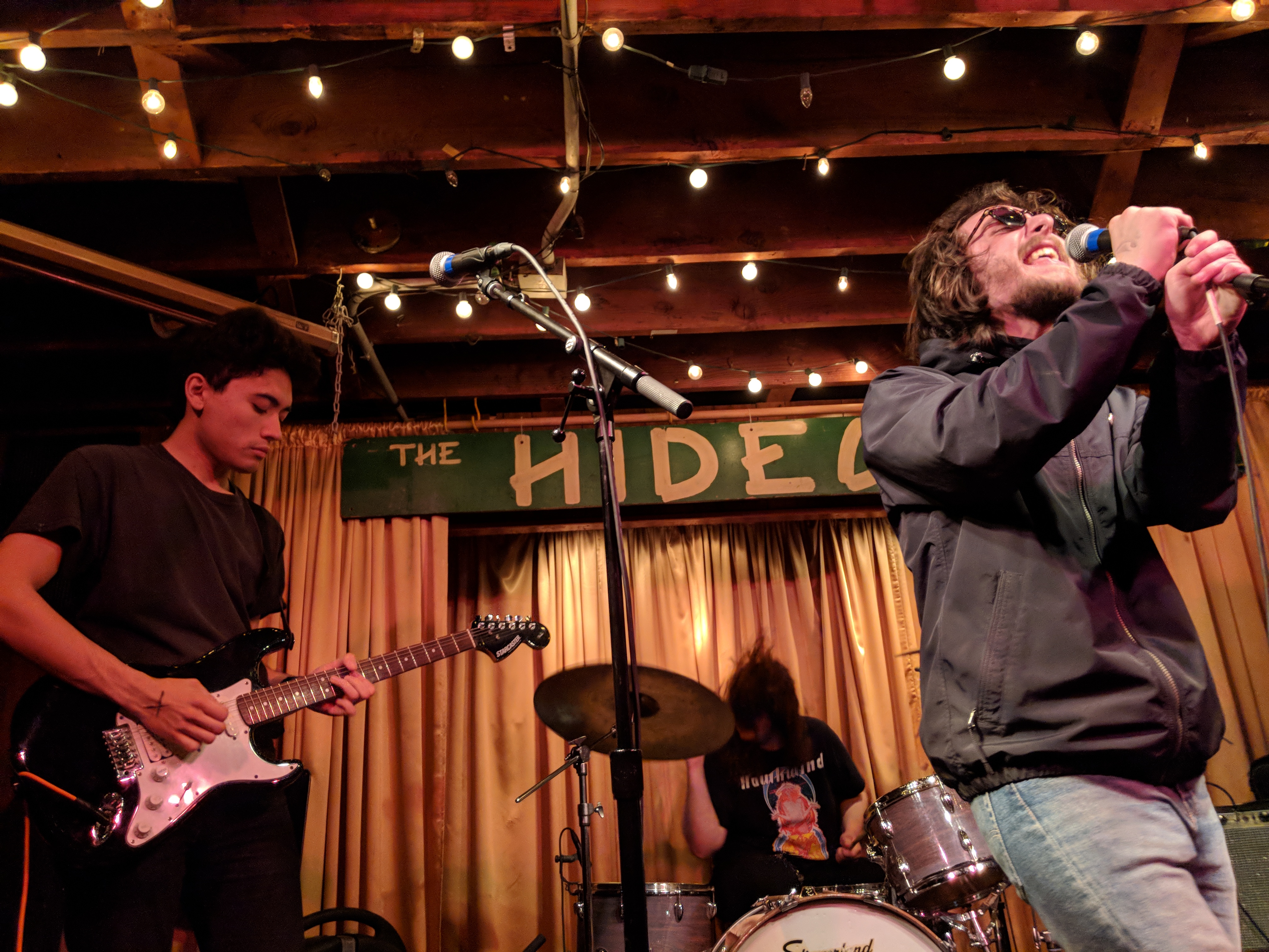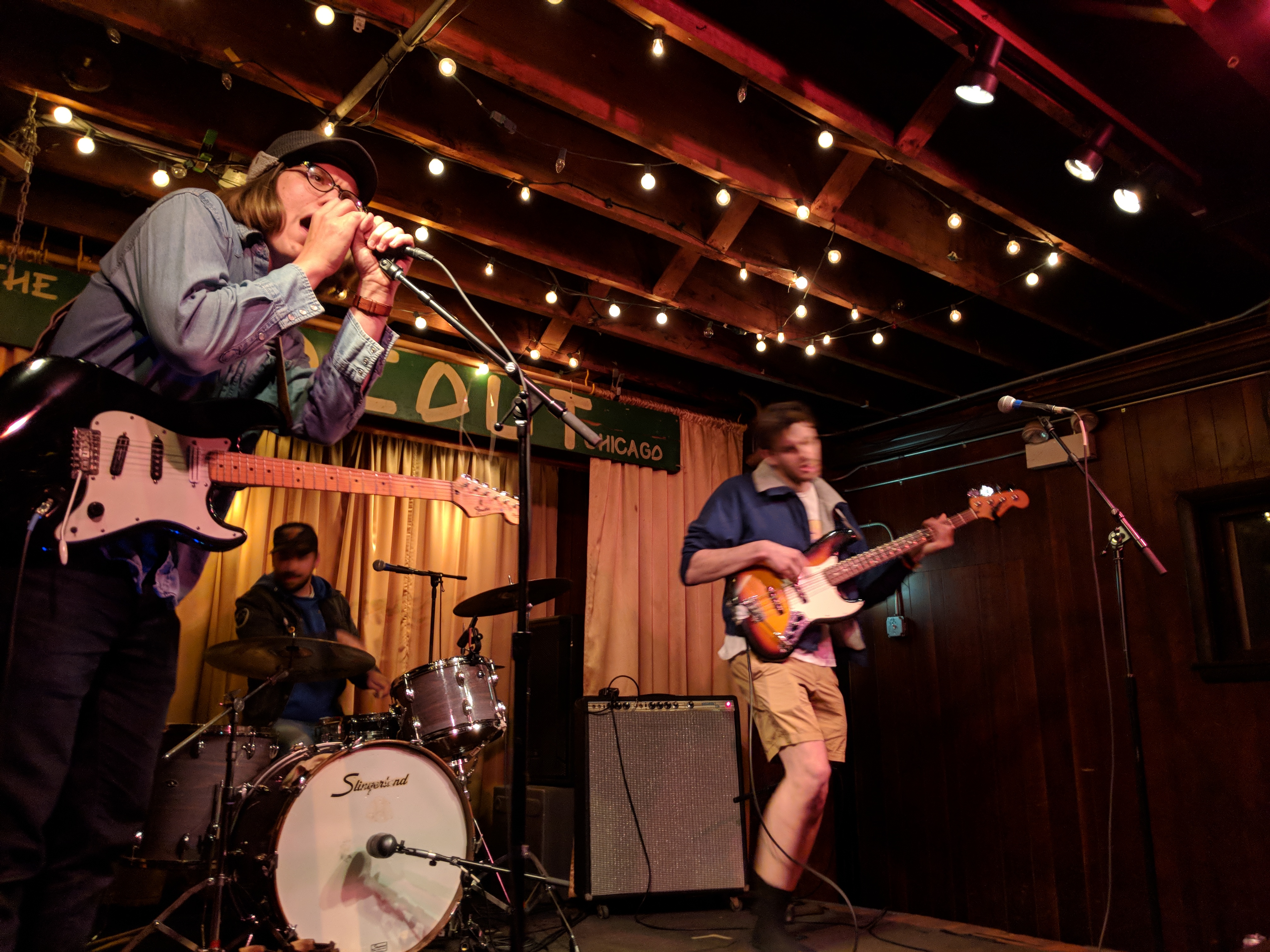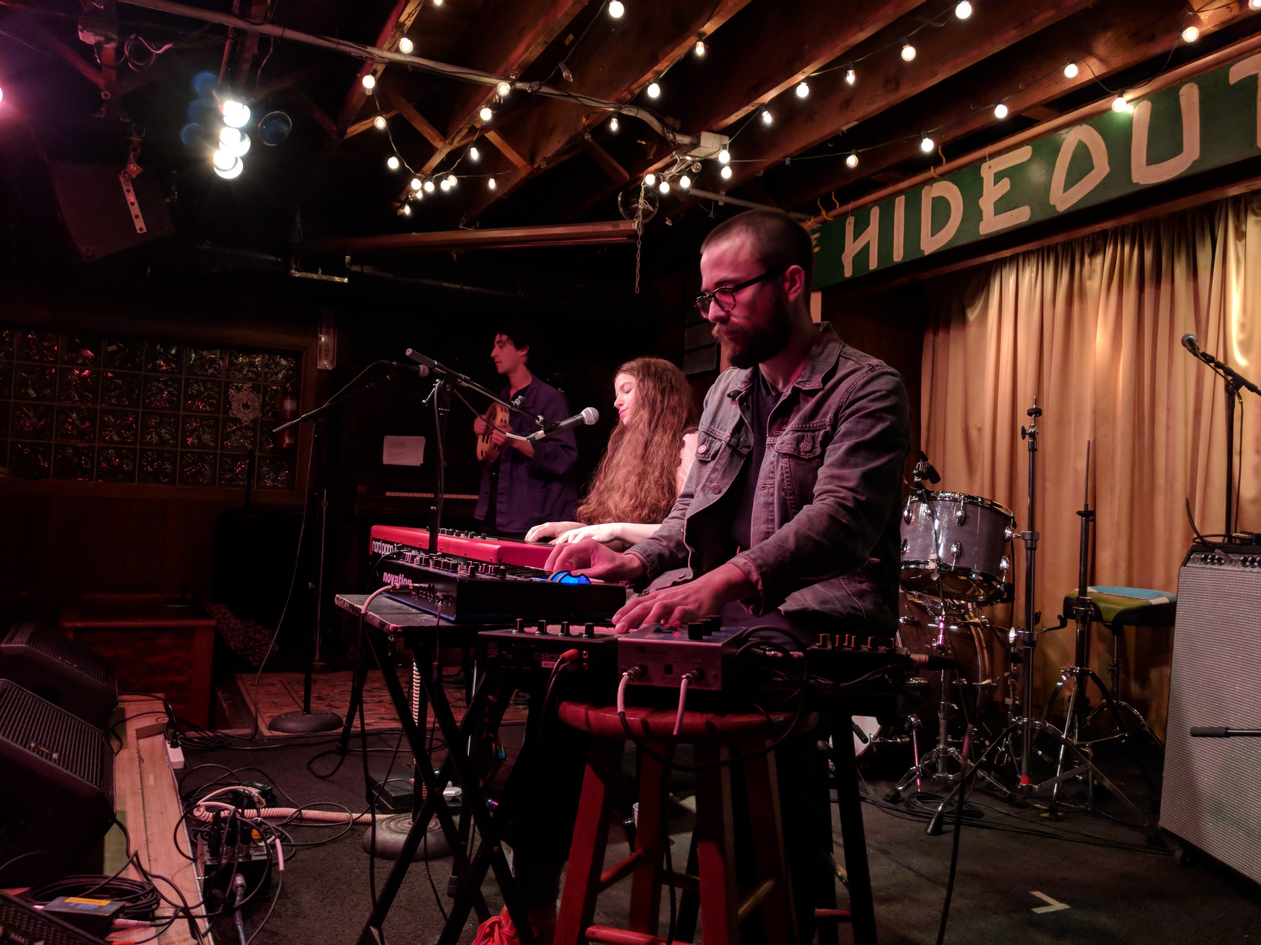 Pointers had three guys on the stage and a fourth experimenting with projecting images onto the band. In the way it was used, I’m not sure it added anything beyond blinding the drummer. The three musicians definitely seemed to be exploring their way through the set. Chatter about what song to play next may have been intended to seem improvisational, but it drained some of the energy from the room. But, they had nice bouncy tunes. I especially liked “Streetcrosser,” and did feel driven to go find it on their Bandcamp page afterwards for repeat listens. Hopefully, they will continue to develop and tighten their stage craft.