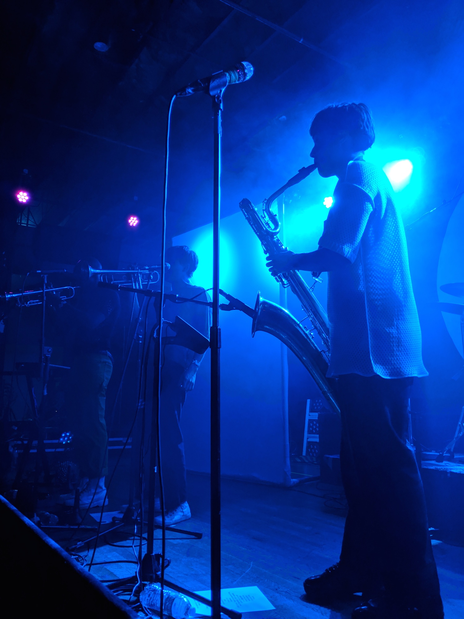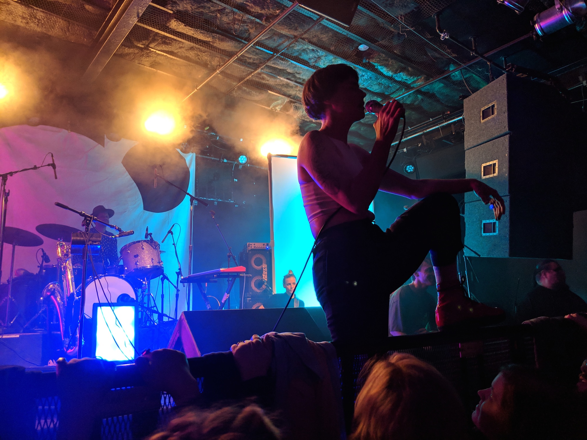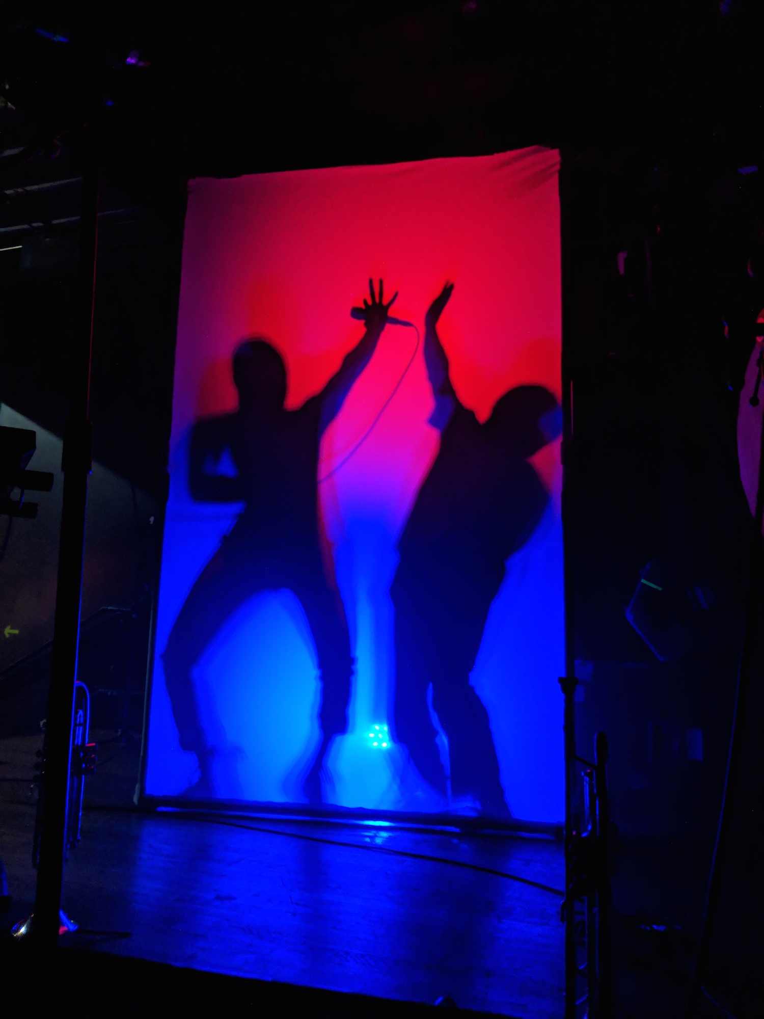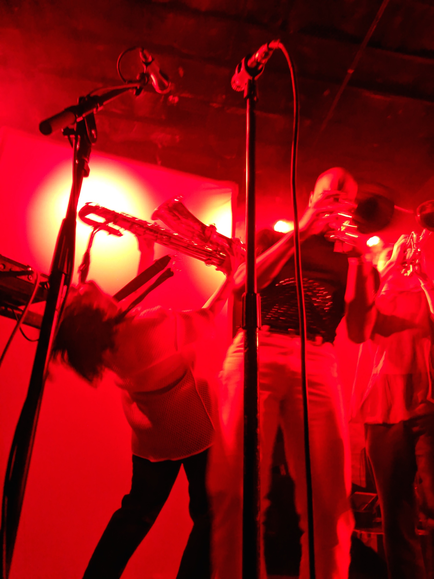 Jeremy took on a much tighter and more aggressive style of drumming than he had for the Tōth set. Ryan and Noga stepped in time, often moved in unison while playing smooth, coolly, and to perfection–just the right amount of fun. Alex and Sean really brought the party with their synchronized dance moves. Kalmia was beautiful and strong. She moved around the stage in a way that was confident and perfectly weird; it brought David Byrne to mind. This is exactly the kind of fully envisioned artistic expression that I can see him producing. The lights, the set, the dance moves, all in support of the music. The whole piece was practiced and yet improvisational. They moved with individual authenticity that was engaging, graceful, and joyful. They were feeling the music and pushed their emotions out to us. That authentic emotion created a connection to the audience that was palpable.