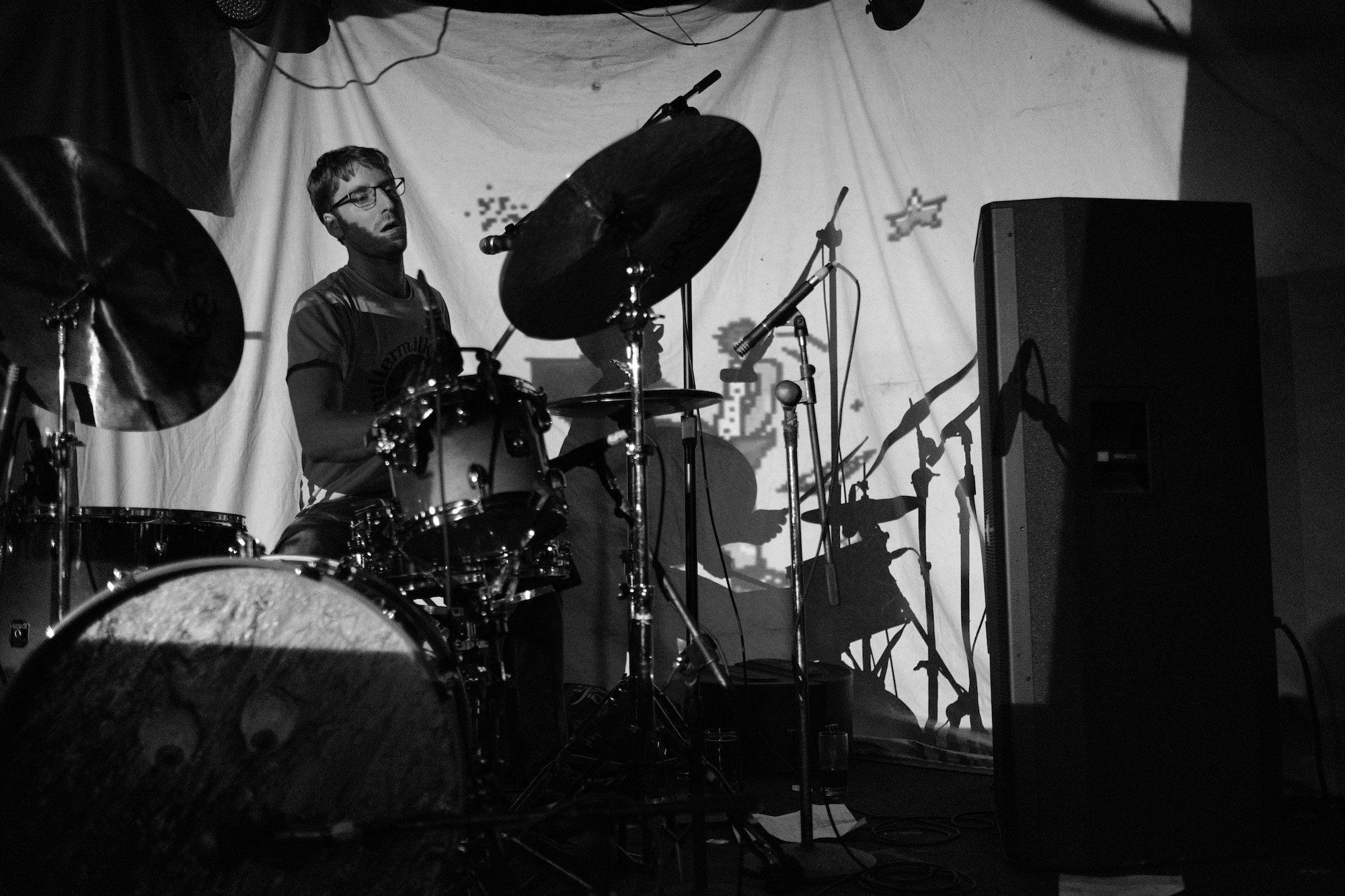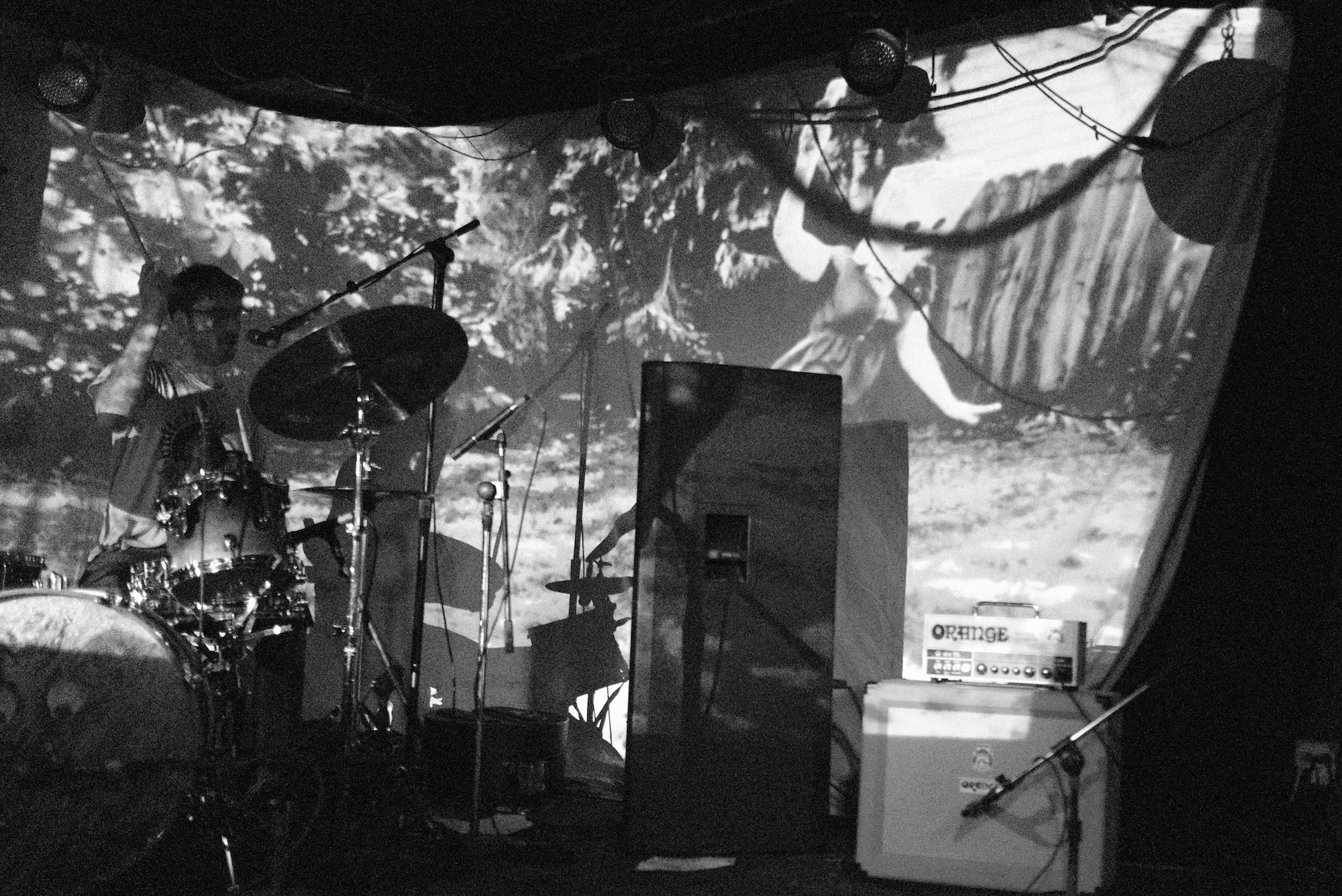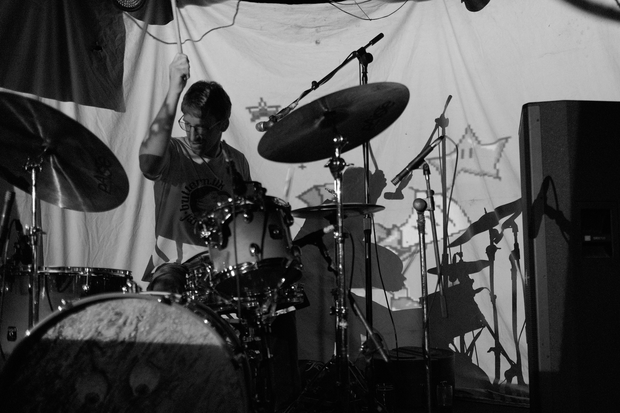 Nearly all the projections featured a figure wearing a paper bag on their head. Mostly innoncuous. The videos started, ended, and ran in the middle of their set. The paper bag wearing hero would wave from a distance through the foliage and make funny little noises that could be hellos. While Throwaway played “Revenge,” the figure had a toy sword and sliced through the air at an imaginary foe. When Jonathan Taylor was drumming for Saajtak, he carefully crafted noise jazz. For Throwaway, you could see it was still carefully crafted chaos, but it was more aggressive.