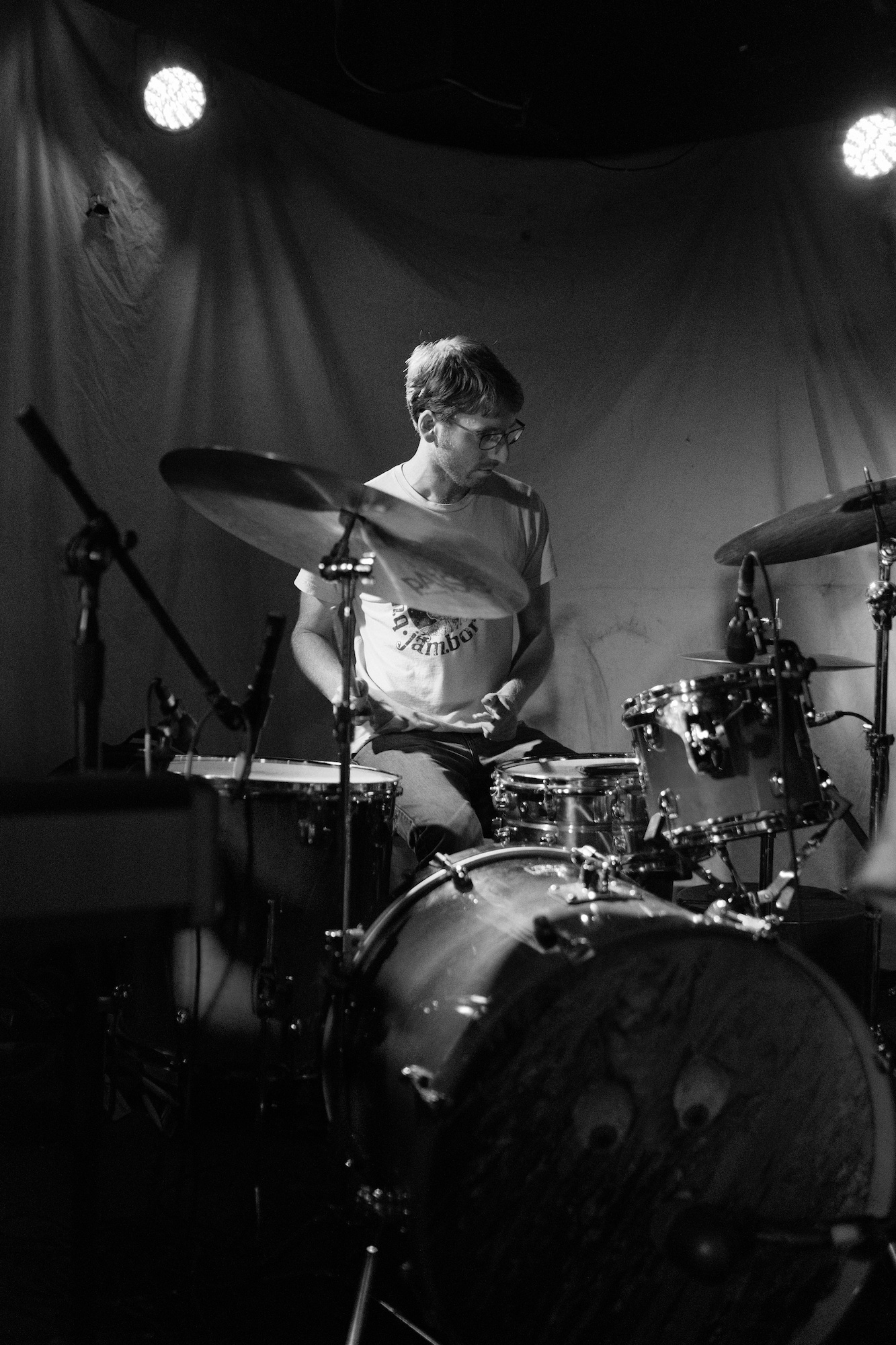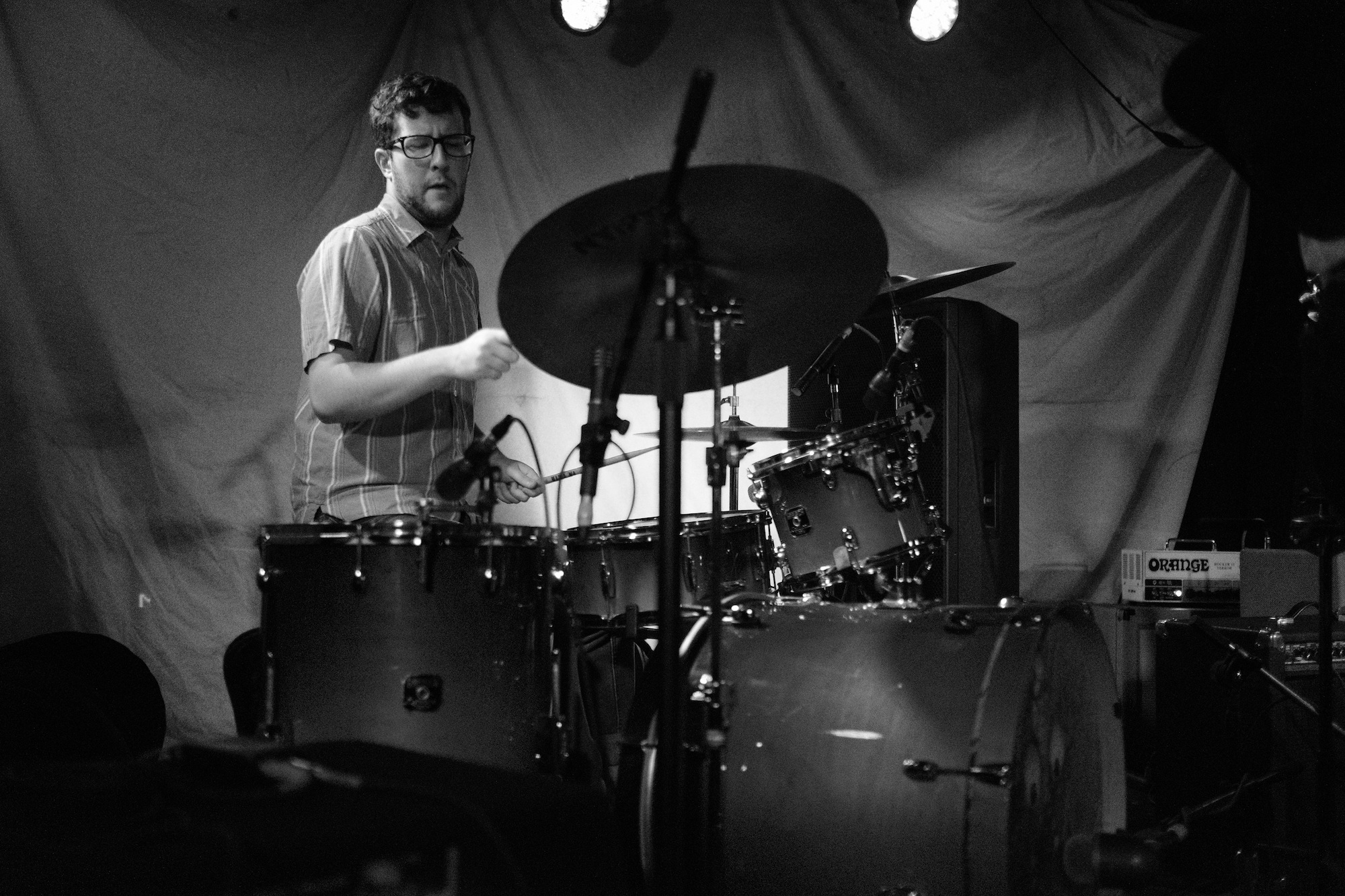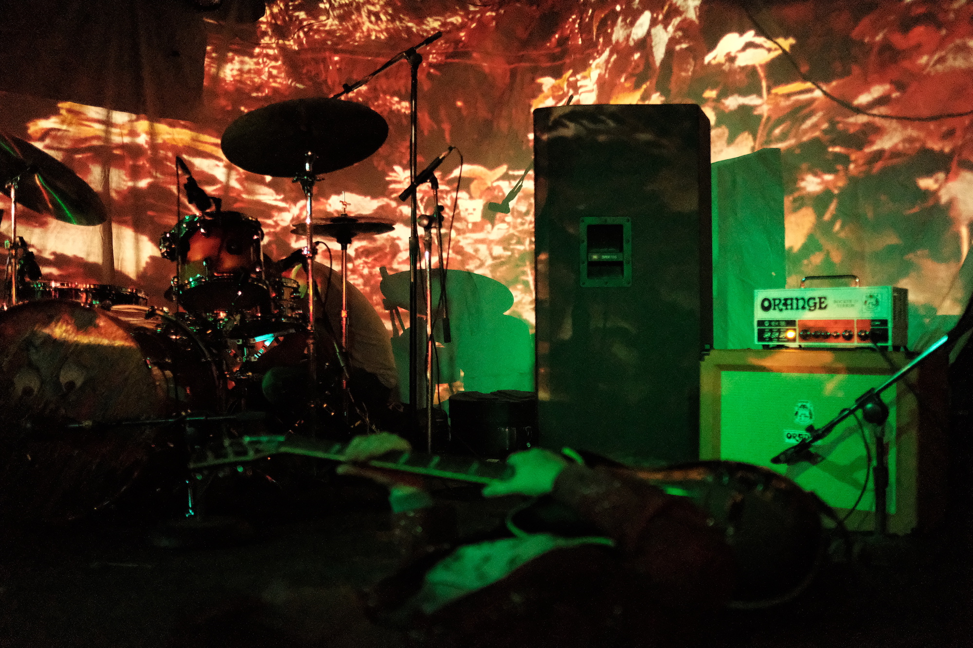 Nearly all the projections featured a figure wearing a paper bag on their head. Mostly innoncuous. The videos started, ended, and ran in the middle of their set. The paper bag wearing hero would wave from a distance through the foliage and make funny little noises that could be hellos. While Throwaway played “Revenge,” the figure had a toy sword and sliced through the air at an imaginary foe. When Jonathan Taylor was drumming for Saajtak, he carefully crafted noise jazz. For Throwaway, you could see it was still carefully crafted chaos, but it was more aggressive.