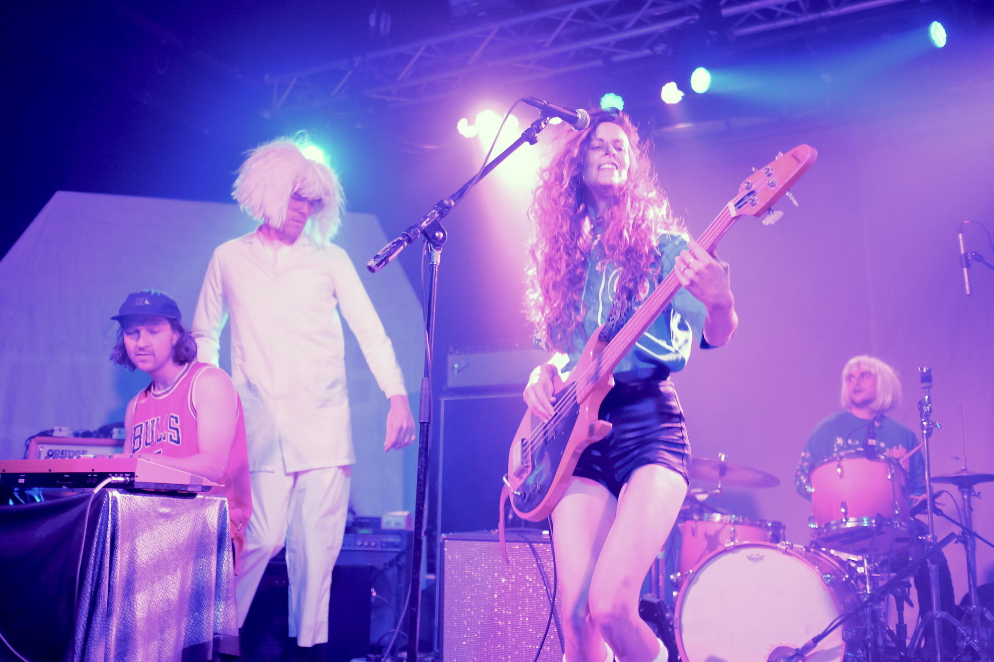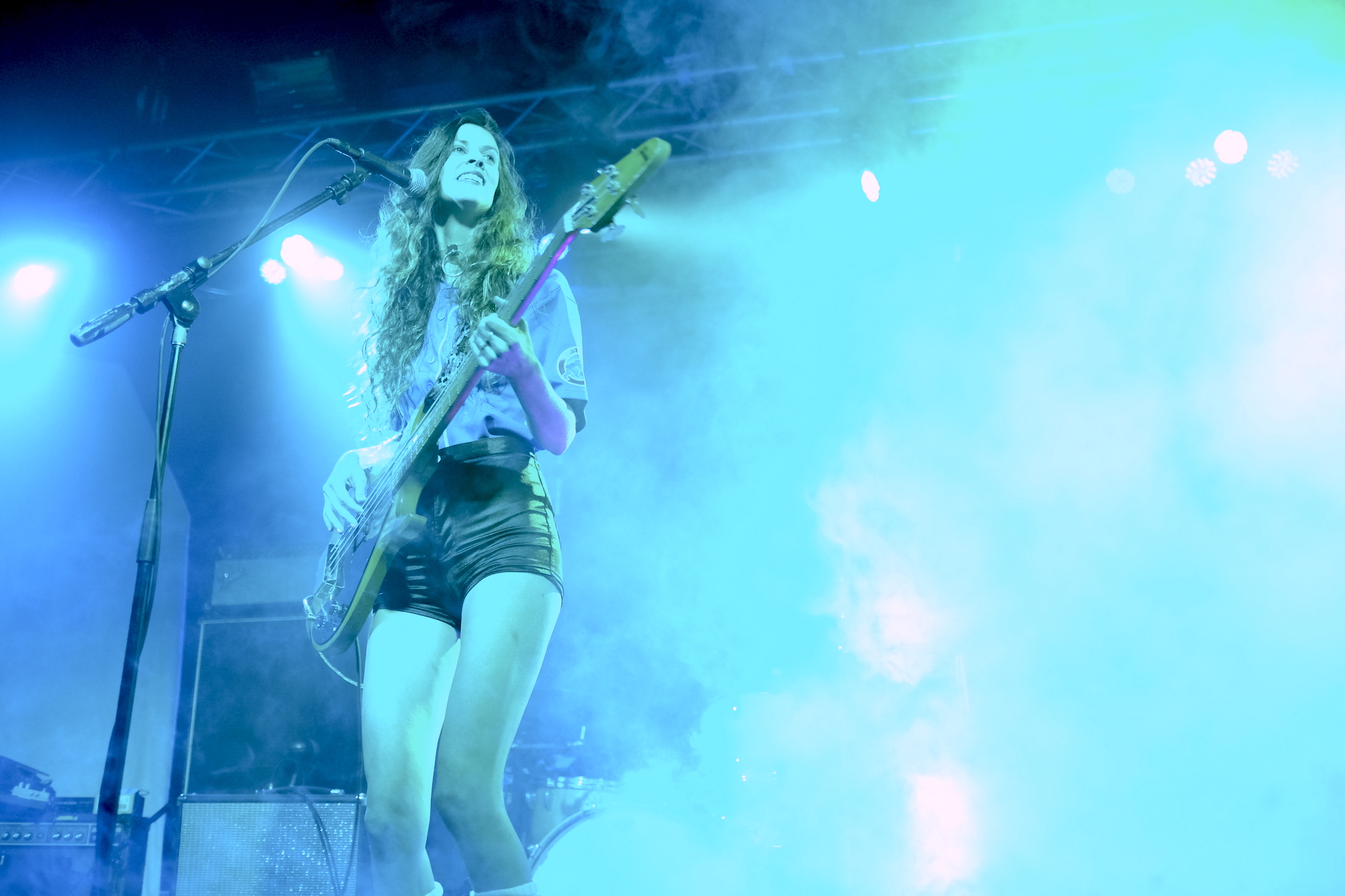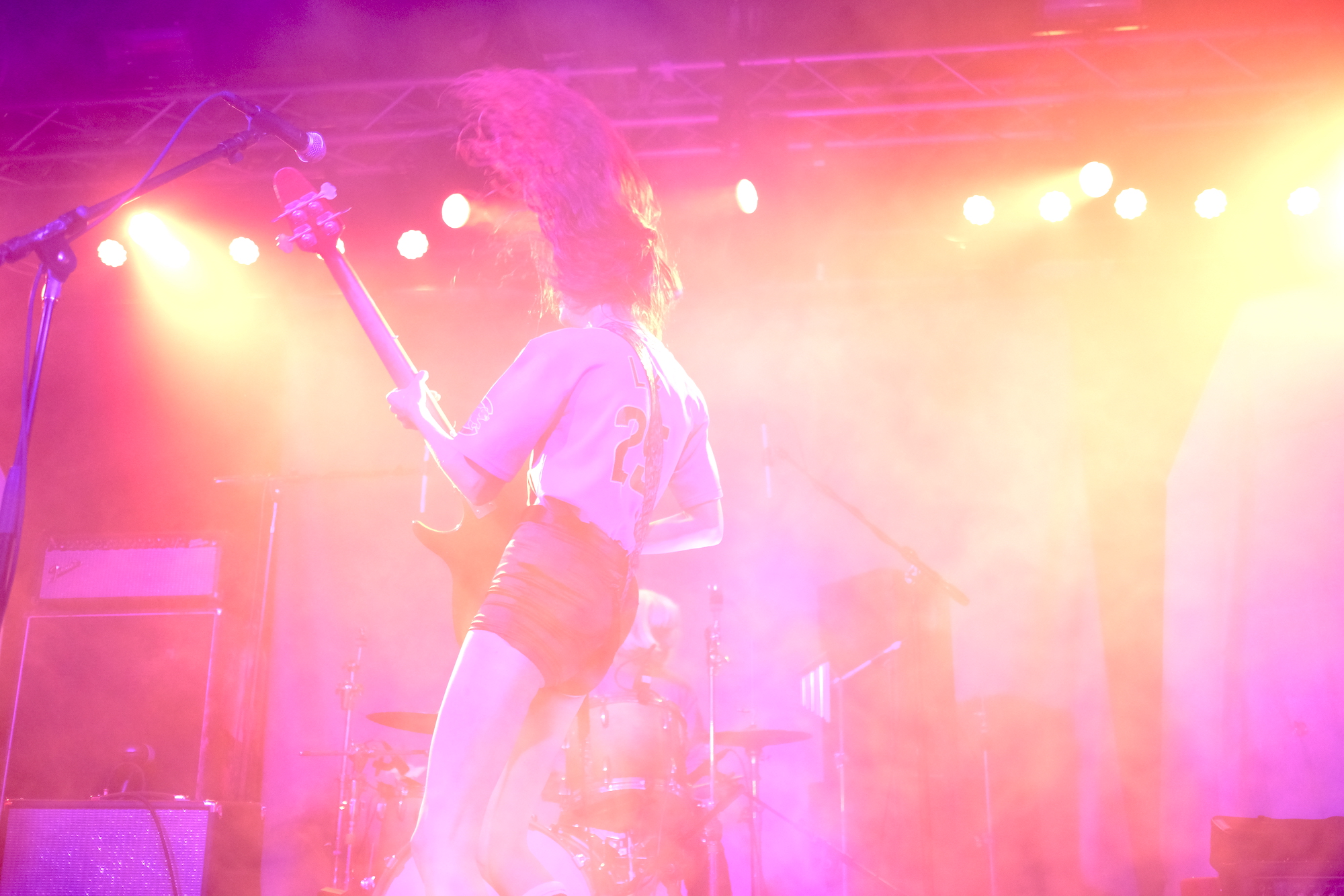 When a caped alien walked on stage, Reptaliens had everyone’s attention. There were cheers over an extraterrestrial greeting. The alien, aka Austin Smith, grabbed a tambourine and shaker and undulated. During the set, he changed outfits, played guitar, and seemed to be an embodiment of what this band is: a bit silly, surreal, and definitely fun. He moved around the stage and danced. Lead singer, Bambi Browning, really loved it. In fact, she had a sense of play with both the music and her bandmates that made me smile. She moved into their space charging and kicking. She rocked back and forth, losing herself in the bass line and then flipping her mane back out of her face, always smiling. When they started playing “29 Palms,” they get a nice little cheer from the audience. I loved the sweet shoulder shrug the key player, Cole Browning, gave us.