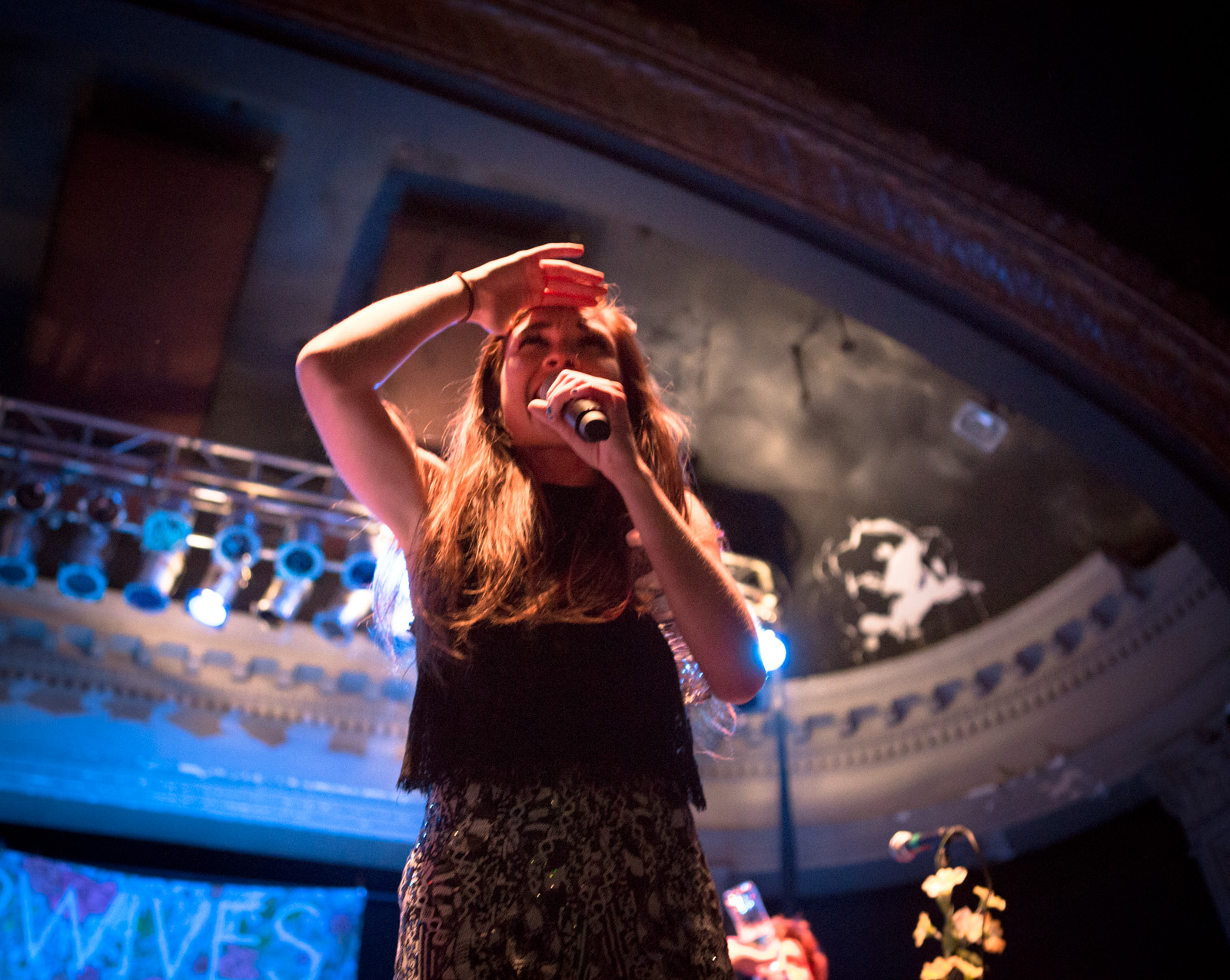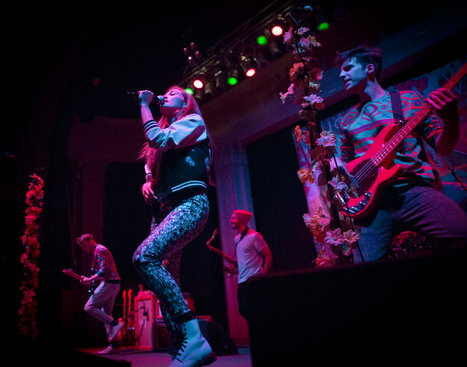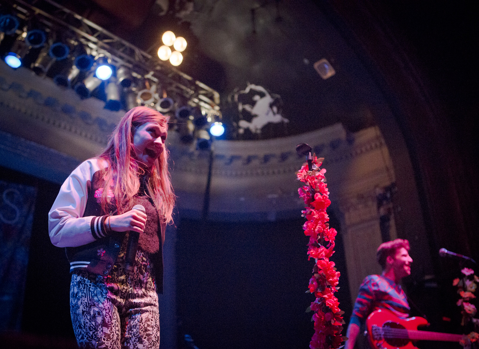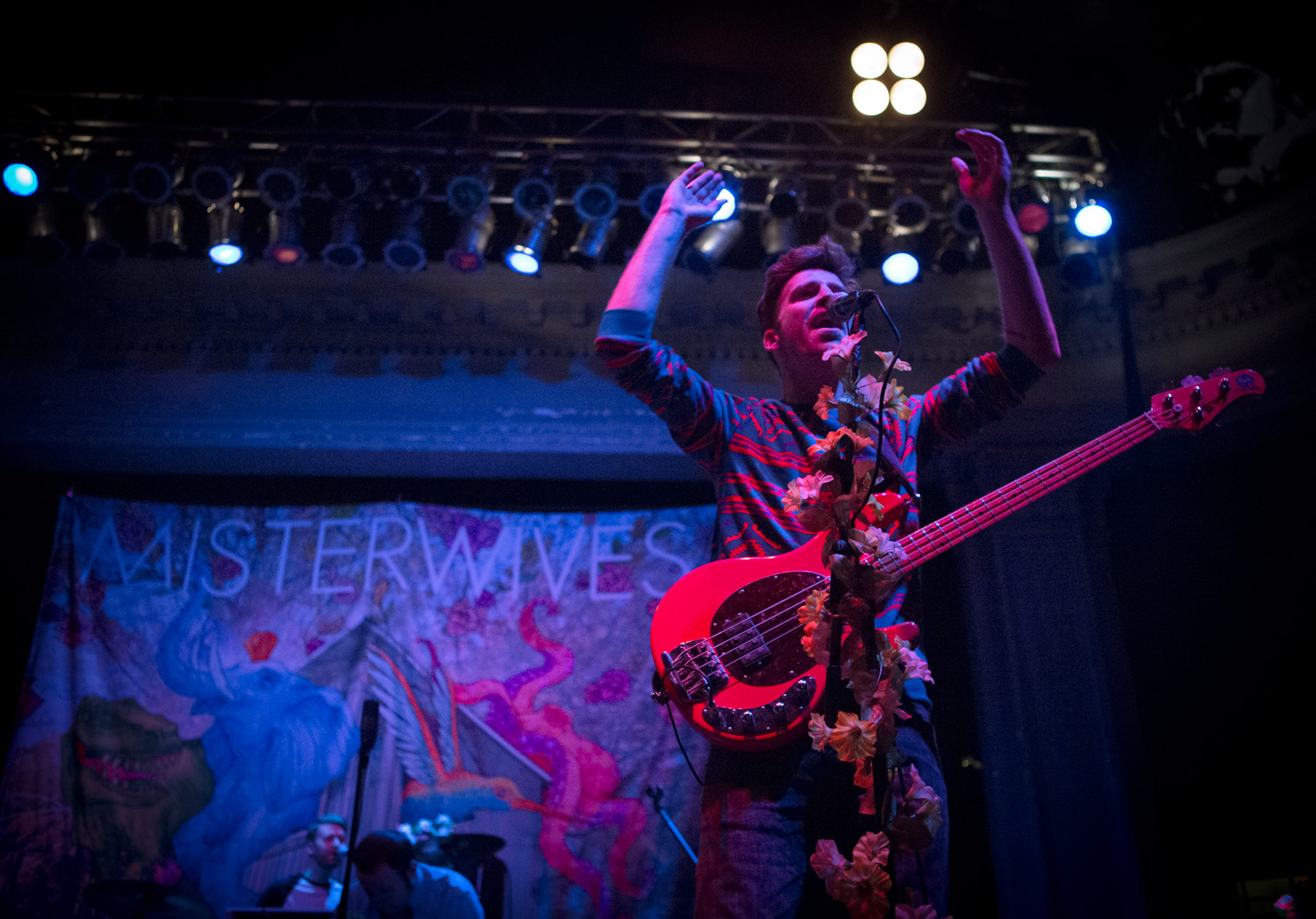 With faux flower-bedecked mic stands and amps, NYC’s MisterWives took the stage with such gusto, that the walls of Newport Music Hall felt as though they might crumble. While Jesse Blum blared away on his trumpet, Mandy Lee jumped, cha-cha’d, and twirled her way around stage, the crowd ate it up and began their own dance party on the floor to the first song of the evening, Our Own House from their recently released debut album of the same name.