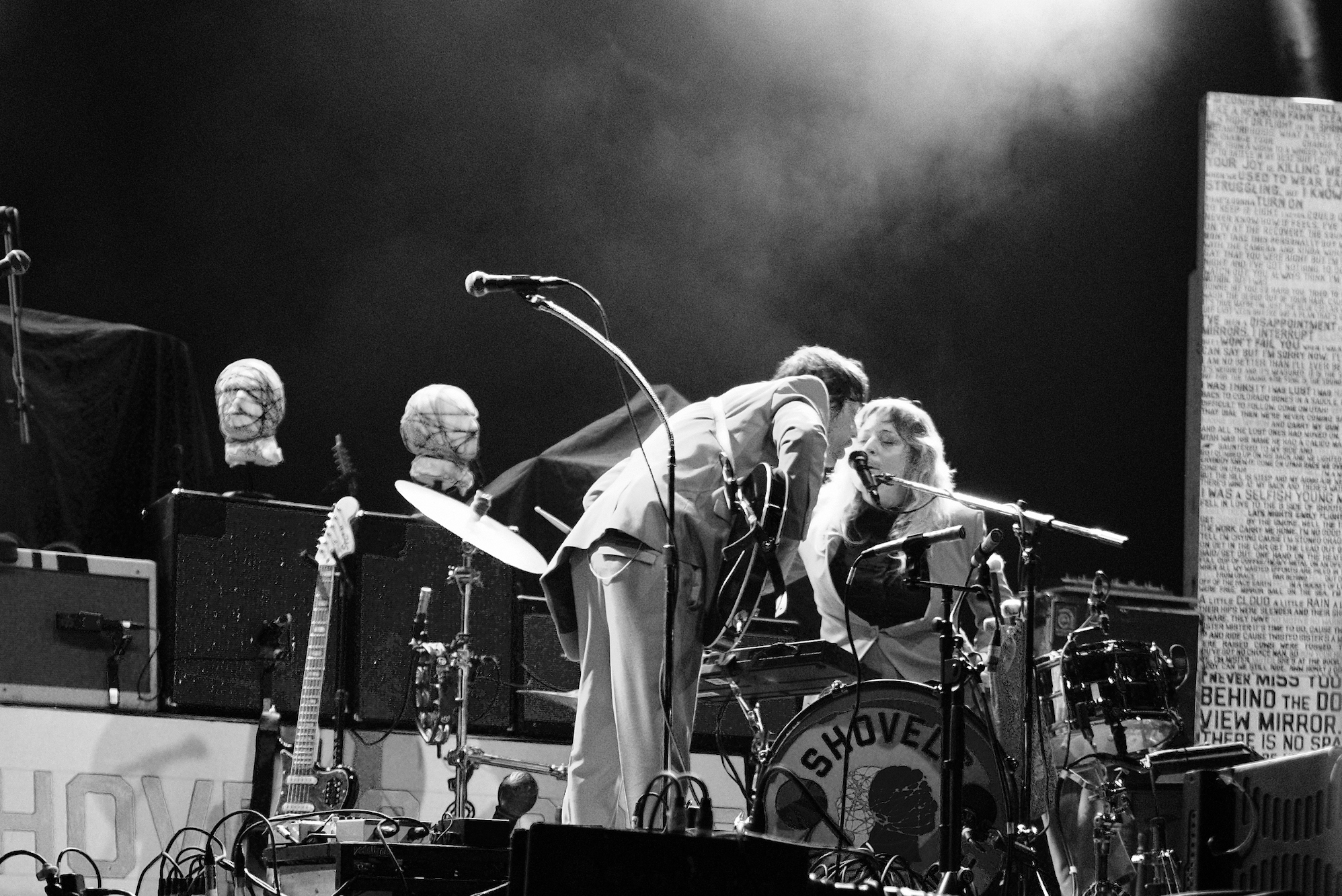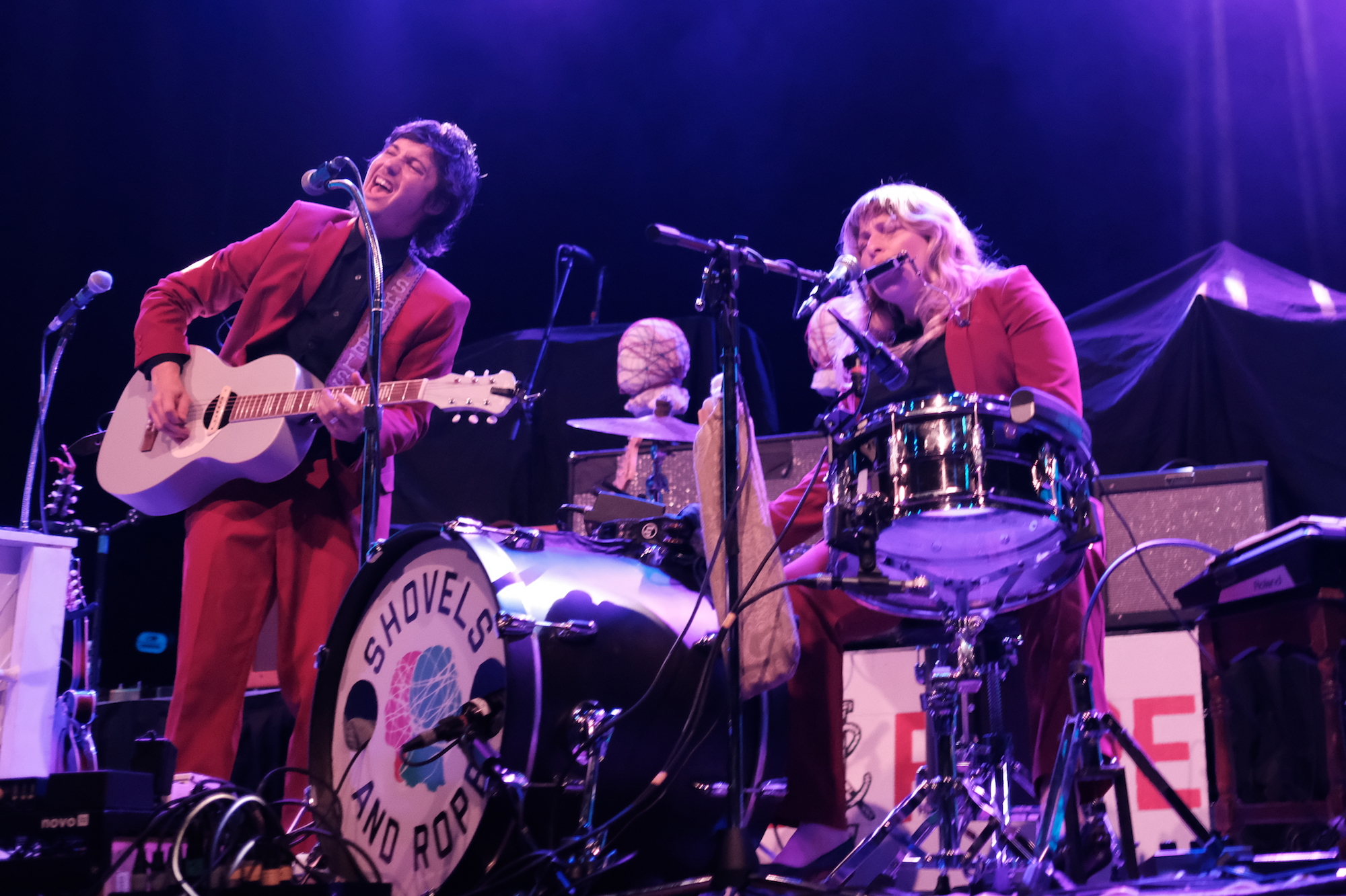 Ballad of Olof Johnson Run, Engine, Run What You Do To Her On, Wisconsin Bumper Cars Freight Train Ogallala Settlin’ or Sleepin’ Around Pins and NeedlesThe amazing life and music partnership that is Shovels and Rope performed with a such a full sound that you’d expect to see at least four people on stage, not two. Michael Trent and Cary Ann Hearst are both multi-instrumentalists; not only do they play drums, guitar, synth, and piano, but they sing in perfect, full-throated harmonies, too. The drum kit was set up like a one man band. The high-hat had a pedal extension that places it far upstage of the kit. They could reach the cymbal with just an outstretched arm. This appears to be in order to give favor to a bass synth. For some songs, the kit is further repositioned or a guitar is played with hands while the feet made the kick drum or high-hat keep time. The experimentation that their arrangements must require (both musical and physical) is part of the fascination of seeing them live.